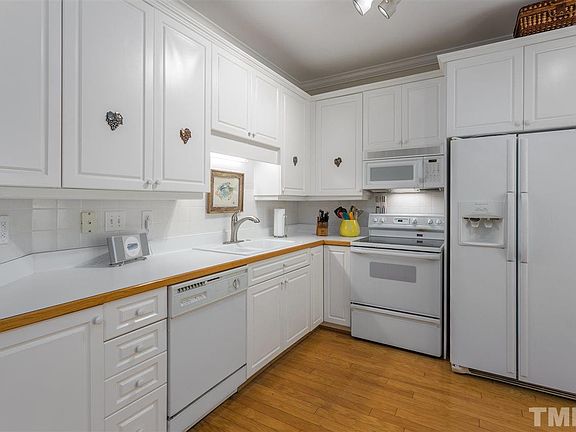 This three story townhome provides a perfect quiet oasis in the heart of Cary.Desirable Wimbledon is a pool and tennis community. Hardwoods on 1st and second floor. Spend mornings sipping coffee in your sunny kitchen or deck that backs to a wooded area.Kitchen has white cabinets, pantry, and microwave.The second floor has two roomy secondary bedrooms. Master w/ garden tub, separate shower and large walk in closet. Third floor could be fourth bedroom, with full bath and closet, or large bonus/media/office.