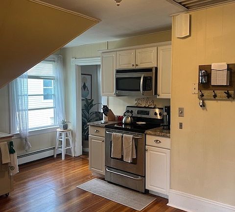 The one you have been waiting for! This approximately1000 sq ft 1 bed/1 full bath apartment in a lovely multi family home can be ready to occupy July 1st. Step into this adorable 3rd floor apartment and fall in love with the character and charm. Ceiling height is 9ft with the most gorgeous woodwork and gleaming hardwood floors. As you walk into the apartment and into the sun filled living room you will be delighted as to how well maintained this home is. The owner completed a remodel of the kitchen and bathroom . Kitchen has a walk-in pantry and off the kitchen is space for either additional storage or use it as small office. The updated bath has subway tiles, new toilet and vanity. The kitchen cabinets are white and has some stainless steel appliances. The bedroom is large and with plenty of closet space. Stay toasty with gas heat and cool with window units. The yard is fantastic and the garage space is one and also one assigned spot. Walk to bus, shopping and quick drive to WH Center and Blueback. Close to highways. 1st and last months security deposit. Credit check and background check. Landlord takes care of lawn care and snow removal Income must be 3x monthly rent. NO PETS. Tenant pays heat and electric. Water is included.