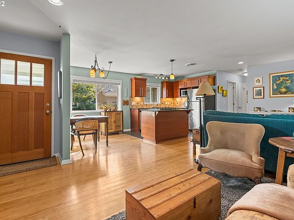 Mt Tabor condo in lush treed setting includes 2 beds + 1 bath. This charming single level unit only shares one wall and features a gas fireplace in the living room plus mini split for heat/AC. Living room, dining room have bamboo floors, bedrooms are oak. The primary bedroom has slider that opens to the private sitting area and dog run with gate. Kitchen with large cook island features builtin gas range. Solid HOA, currently no rental cap. Just blocks to Mt Tabor Park + perks of Montavilla.
