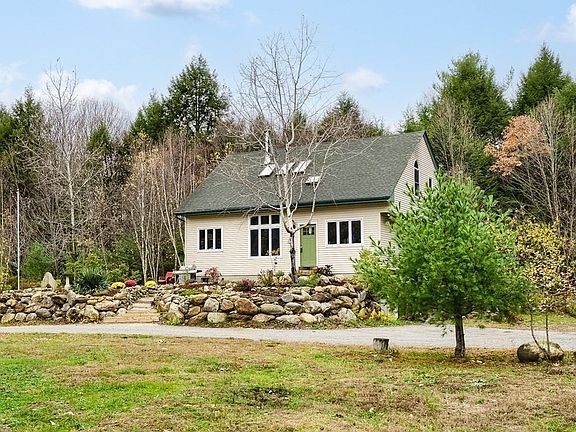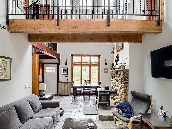 Serene 5+ acre private retreat featuring beautifully updated passive solar, post & beam contemporary cape, 2+ stall, 2 story barn with water/power perfect for horses, goats etc. pasture, fruit trees, berry bushes, gardens, circular driveway, frontage on Five Mile River and abutting State Forest with Foley Pond! Main floor features include open concept with vaulted ceiling, gorgeous updated kitchen featuring natural cherry cabinets, modern concrete composite counters and Energy Star stainless steel appliances including an induction cooktop, vaulted dining/living room with wood stove & mini split heat/ac, first floor bedroom, full bath and laundry room rough plumbed for shower. The second level features the main bedroom with vaulted ceiling & built-ins, full bath with shower & soaking tub, adorable guest bed nook with skylite connected by a catwalk over to the 3rd bedroom/loft currently used as home office. Walk-out lower level plumbed for 1/2 bath, loft plumbed for sink.