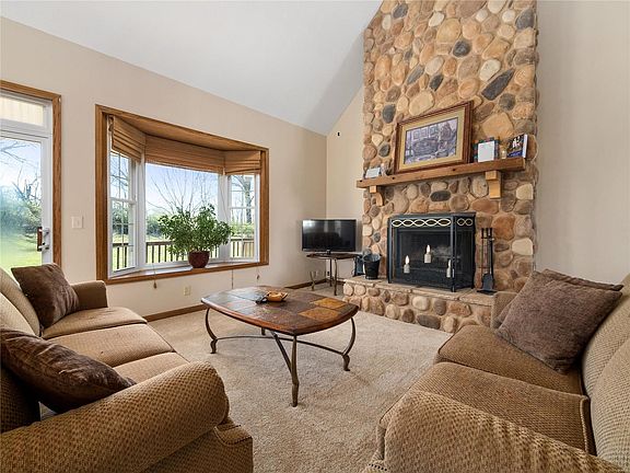 If privacy and land is what you are after, look no further! 1.5 story situated on 3+ acres of level land backing to trees with a pool. 2 story entry leads to the great room with soaring ceilings, woodburning fireplace with stone surround and slider to the covered deck. Kitchen features tons of cabinet space, with 42 cabinets, and counter space, adjoining breakfast room with bay window. Main Level master suite with coffered ceiling and full bath with double sinks, walk-in shower, walk-in closet and large linen closet. 2 additional bedrooms, bonus room and full bath on the upper level. Finished walk-out lower level with Rec room, office, sleeping area, and full bath. Additional features include ML laundry room, all electric utilities, 2 car garage, newer carpet, newer roof and more!