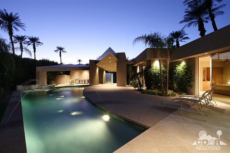 Waterford - one of the most prestigious private communities. Guy Dreier - an International Architectural ICON! Put them together and you've got a stunning contemporary world class showpiece! Featuring dramatic disappearing pocket doors that seamlessly blend indoor/outdoor living to create the ultimate desert lifestyle experience. Dual custom fireplaces with fire and ice sit adjacent, one in the living room, the other in the loggia separated by massive glass pocket doors that disappear into the wall. Simply stunning! Mountain views adorn the sunny SW exposure. A covered outdoor pavilion with BBQ island focuses on uniquely designed extended pool with 8 fountains, waterfall and inlaid spa. Inside is equally fabulous, featuring a dramatic use of stone, granite, marble and limestone. Large electric shades keep the home cool but bright. Chefs kitchen is a thrill w/Italian glass tiles, zebra wood, bamboo cabinets. This is a one-of-a kind rare find and must see for every architectural enthusiast!