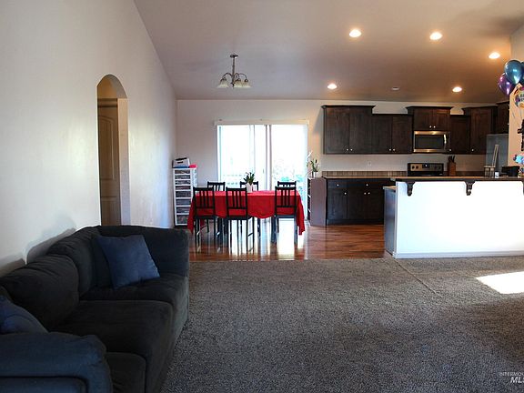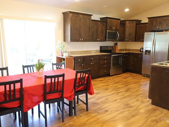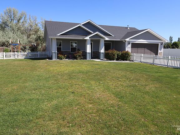Discover this custom-built, single-level gem, perfect for family living! This spacious 4-bed, 2-bath home sits on a generous .31-acre lot. Open floor plan w/popular split bedroom design, ensuring privacy & functionality. Kitchen boasts, pantry, stained cabinets, & durable laminate countertops, complemented by luxury vinyl plank flooring extending into dining room. Living room’s vaulted ceilings add an airy feel, while custom pull-down shades provide both style & convenience. Bath off primary suite w/dual vanities & walk-in closet. Imagine stepping outside to a cozy patio in the backyard, where you can unwind & enjoy sounds of running water in the late spring & summer. Fully fenced front yard offers both privacy & space for activities, creating a perfect setting for relaxation & outdoor enjoyment. Sprinkler system with pressurized irrigation. 2-car garage offers additional ceiling shelving for extra storage. With low-maintenance vinyl siding, this home is as practical as it is beautiful. It’s truly a must-see!