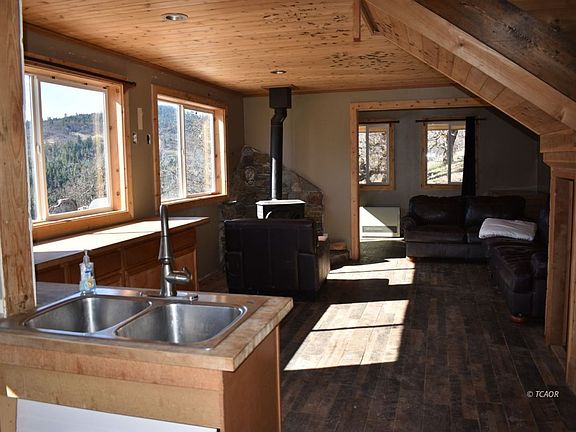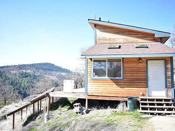 This 2 story 1/1 cabin is perfectly placed on 10 sunny acres. High perched cabin has newly redone hardwood-styled porcelain tile floors, skylights, a nice mix of wood trim work and sheet rock interior. For heat there's a wood stove wrapped in stone and propane gas heater. Sunny, south-facing windows bring in the mountain and river views. The property spans from remarkable grassy river gorge meadows to riverbank flats down below. Deck off the home is perched to allow time to soak in the sun or soak in the views at your leisure. There are multiple flats and garden sites and water storage tanks stepping up and down the acreage, one with the ribcage of an abandoned greenhouse. The land itself has great value from views to river frontage. There is no well, previously river water or deliveries. Home and Septic are built with no permits and have violations for being non-conforming (per Trinity County Building and Planning Dept). Buyer to investigate and educate as to all aspects of the process. Steep dirt road up to residence at the top of the property, high(er) clearance vehicle is recommended to see home and interior