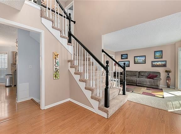 Oh so desirable location in Olathe’s Southdowns neighborhood. Beautifully maintained and big ticket items have been updated for you in the last 3 years - NEW furnace, NEW AC, New Water Heater, NEW gutter guards. Take note of the darling roof peaks and appreciate the low maintenance Super-tough James Hardie Siding and 25 year paint, sealed and wrapped windows, and composite shutters. On the main level there is a front living room, formal dining, 1/2 bath, walk through kitchen, breakfast nook, and sunken family room that opens onto the stamped concrete patio. The backyard is privacy fenced and ready for kiddos and doggos!! Master bed and bath are on the second floor with a sliding barn door on the bathroom. 3 more bedrooms upstairs have their own full bath with double vanity. A bonus room is attached to bedroom 2 for study, storage, or just lots of toys! The finished basement has a 3/4 bathroom and rec room for guests and gatherings. A big 24x15 unfinished room in the basement is optional workout / storage space. Come visit and enjoy a complementary snack while falling in love with this home and neighborhood !