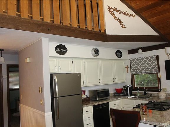 Home sit on 1.55 acres, with a stream running thru it, and a beautiful pond for your relaxation. New blacktopped driveway leading to a very private setting. 3 bedrooms, 2 1/2 baths. The main level has open floor plan. Kitchen has been updated, new counter tops, sink,faucet, and new Bosch dishwasher. Living room updated with picture window,storm door, new fireplace front, and new lighting. Loft bedroom and bath, has been updated with new carpet and vinyl flooring, and a new taller toilet. The main level bath, has been gutted and remodeled. The window in this bath has been replaced with a glass block window. This home offers home surveillance system, multi-flow septic system/county water, new roof-2018,updated electrical, newly installed mini splits for cooling & heating, replaced front support beams, installed light filtering solar shades and solar film to front windows, installed faux wood blinds in bedrooms and upper bathroom windows, laminate flooring in bedrooms on main floor.