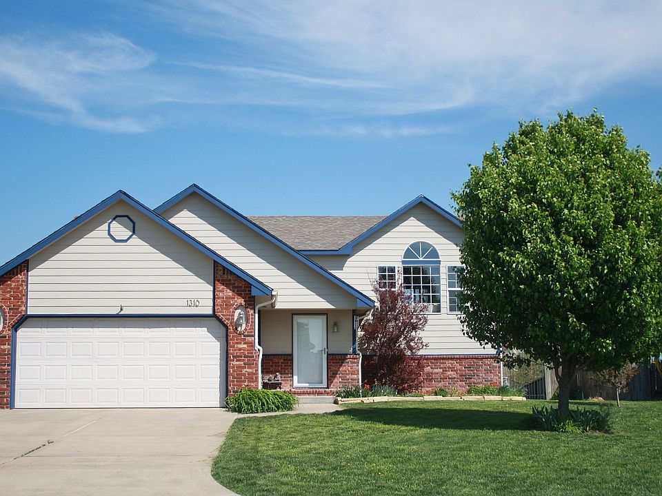 Gorgeous lake view from dining room, kitchen area and deck. Wonderful 4 bed, 3 bath, 2 car garage, walk out and view out finished basement home in Goddard's desirable Seasons subdivision. Built in 2000. New interior and exterior paint, new roof and gutters! This home offers windows galore and tons of natural light!!! Oversized beautiful arched window adorns an entire wall in the living room plus tall vaulted ceilings and a cozy fireplace make this the perfect place to relax after a long day. Open kitchen feeds into dining room and living room. Kitchen features four areas (walls/cabinetry) of upper decor space, specially designed for your personalized touches. All kitchen appliances remain with home. Enjoy the lovely lake view while dining. All 4 bedrooms are spacious! Huge master bedroom measures 21 x 12 ft, plus it has an oversized walk in closet. Don't miss the large master bath linen closet too. Master bath has private toilet and double vanity. Finished basement includes: 25 x 21 ft family room; dry bar; built-in entertainment center; 2 bedrooms; full bath with whirlpool tub; storage area under stairs and laundry/storage room with utility sink. True walk out (no messy pit) to fenced backyard and patio. Located close to the Tanganyika Wild Life Center - always fun for the kids and family. Special taxes minimal and pay out in a few years. Goddard school district.
