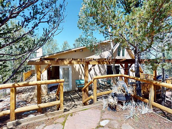 Meticulously maintained mountain getaway with 2 Bedrooms and 2 Baths on 5.5 Wooded acres! This home includes the adjacent property to assure your privacy. Includes both a wood burning fireplace in the family room and a gas fireplace in the living room. Tons of windows letting in the natural light and beautiful surroundings. Two outbuildings, a shed and detached garage. All structures have a Stucco exterior and Metal roof! Garage is 2,400 sq. ft. with 220 volts. Room to relax on the wraparound deck with views of Pikes Peak through the trees. Beautiful hardwood floors, large picture window, expansive eat in kitchen. Washer/dryer included. Backs to Public Land that will never be built on! Cripple Creek Mountain Estates has a clubhouse with a heated indoor pool, fitness center, tennis courts, playground, and more! Short term rentals allowed. Located just minutes from historic Cripple Creek with casinos, restaurants, and shopping. Easy commute to Colorado Springs! Close to everything outdoors: Gold medal waters at Eleven Mile, Mueller State Park, Fossil Beds, National Forest, hiking, horse, ATV, & biking trails. Move In Ready!!