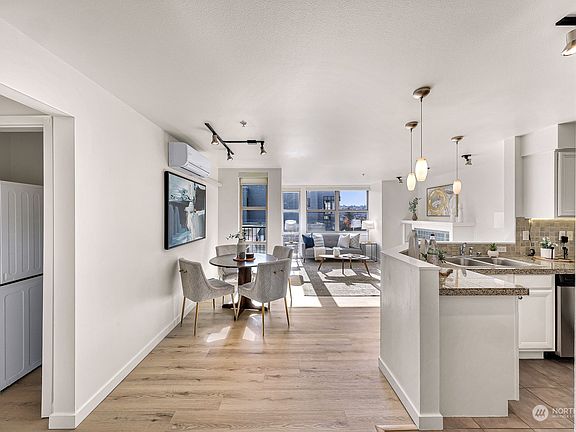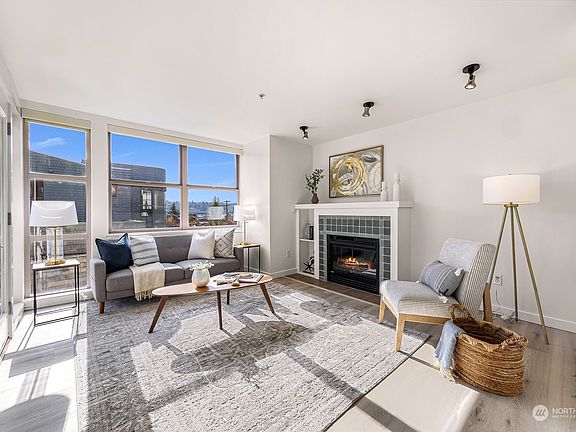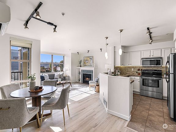 Welcome to your gorgeous, move-in-ready condo, featuring new AC & an abundance of natural light thanks to its Southern exposure. Step inside the spacious entry way to discover brand new LVP floors that lead you into a sunny living room w/ cozy fireplace & built-in shelving. Open kitchen boasts a spacious worktop and S/S appliances. Retreat to the light-filled primary suite w/ large closet & ensuite bath w/ glass shower. Plus a 2nd bed, additional full bath, & convenient laundry facilities. Take advantage of the rooftop deck, offering stunning city & lake views. Fresh paint, new carpet, deep closets, secure parking, & extra storage, all in a prime location close to the Burke-Gilman Trail, public transport, restaurants, and freeway access.