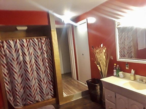 Enclosed front porch. Living Room: Laminate flooring, painted walls, nice size room, off white walls. Kitchen: Large eat-in, laminate flooring, black cabinets, off white walls. Bath: Very large room, extra large walk in shower, large vanity, also washer and dryer area, plus storage. Master Bedroom: Nice size room, off white painted walls, laminate flooring. Bedroom: Painted walls, carpet. Upstairs is 2 more bedrooms, painted walls, closet. Central air and gas furnace. Nice size back porch that you could use for summer dining. Basement.