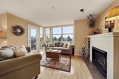 Fabulous downtown, Lake Union, & mountain views from this south facing corner unit in the heart of Wallingford! This open floor plan offers great entertaining spaces, large kitchen w/granite counters, full size pantry, stainless appliances, stackable W/D, tiled entry, and a glass breakfast bar. Living room has hardwood floors, a private patio, built in book cases, and a gas fireplace. The level of quality will not be found in other condos at this price point! Don't miss out on this property!