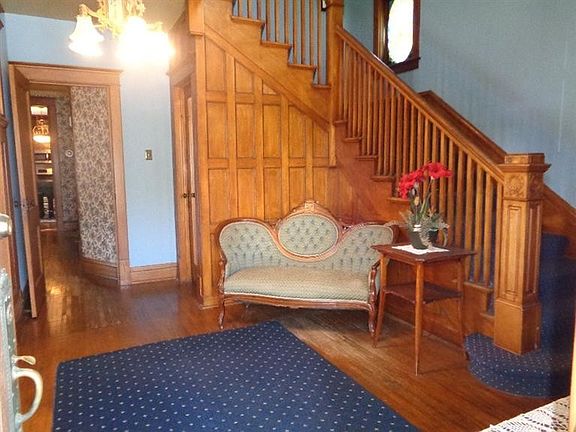 Charming Victorian w/TONS of Character! Recent Updating Includes Newer Roof, siding, Windows (+glass blk in basement), Electric, Plumbing. Eat-in Kitchen w/granite counters, SS appl+walk in pantry. Main floor master bdrm att to full updated bath w/walk-in shower. Beautiful wood trim. HW floors. Pocket doors. Stained glass windows. Upper family rm could be 5th bdrm. Large front porch! Parking for 6 cars. A must see! Just darling. Come take a look.