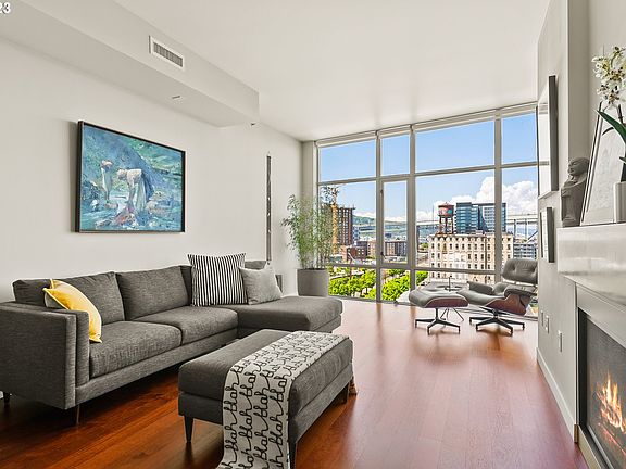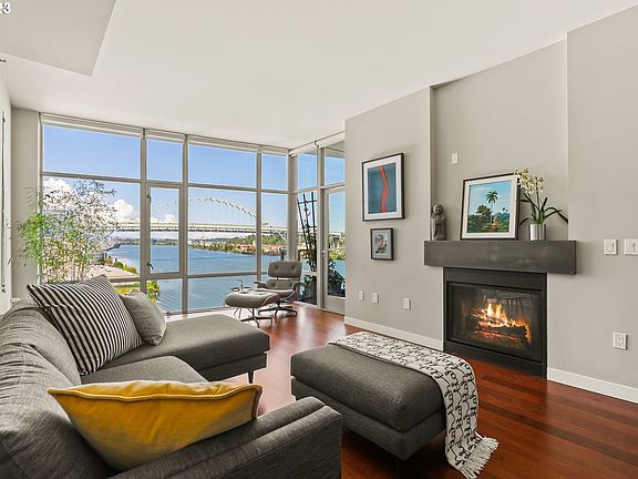 Penthouse condo at Waterfront Pearl offers breathtaking panoramic views of the river and the city skyline from every room. Floor plan provides open and bright spaces with high ceilings and floor-to-ceiling windows. Spacious bedroom has en-suite bath with heated floor & walk-in closet. Den offers flexibility for office space, media room, guest room. High-end kitchen with Viking appliances, dual fireplace for cozy warmth in both the living & dining rooms, 2 parking spaces, and deeded storage. HOA amenities include concierge, gym, sauna, outdoor patio. This truly is a unique penthouse on the Willamette River in Portland's vibrant Pearl District.