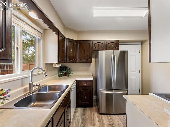 Car Enthusiast’s Dream with Prime Location! Welcome to this well-maintained tri-level home offering 3 bedrooms, 2 bathrooms, and a unique blend of comfort and functionality—perfect for car lovers, hobbyists, or anyone needing extra space. Step inside to discover brand-new luxury vinyl flooring throughout the main and lower levels. Enter into the main level with a good-sized living room with a large picture window that overlooks the well-landscaped front yard. The living room leads to the eating area, which walks out to the beautiful backyard. The upper level features a spacious primary bedroom, a secondary bedroom/office, and an updated full bath. The lower level offers a warm fireplace, the third bedroom, and a bath with the laundry. The attached 1-car garage is just the beginning—this property truly shines with a heated, fully wired, oversized 4-car detached garage, complete with the set-up for a car lift (actual lift equipment not included), finished interior, and an additional attached 2-car carport. Whether you're restoring classics or running a workshop, this setup has you covered. The fully fenced backyard is designed for enjoyment and utility, featuring a large concrete patio, automatic sprinklers, a storage shed, and even a metal storage container for extra gear or tools. Updated vinyl windows, white 6-panel doors, new exterior paint, and a newer roof add value and peace of mind. All kitchen appliances included. Located just minutes from Peterson Space Force Base, Shriever AFB, and the Powers Corridor. You’ll enjoy convenient access to shopping, dining, and entertainment—all while relaxing under the shade of mature trees in your private yard. Don’t miss this rare opportunity—where residential living meets garage greatness!