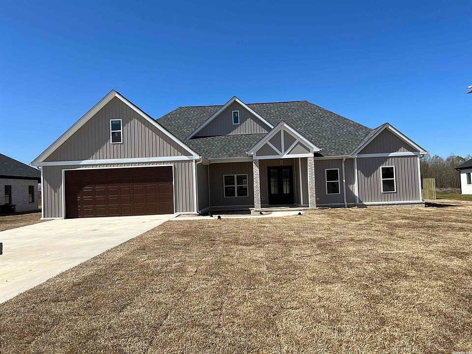 Brand new construction with vertical siding/Brick exterior, granite island kitchen with white cabinetry and black lighting accenting this beautiful home. Huge patio is covered, LVP flooring through out, split bedroom arrangement with gas log fireplace in greatroom. Garage is oversized