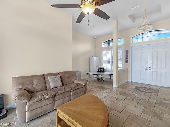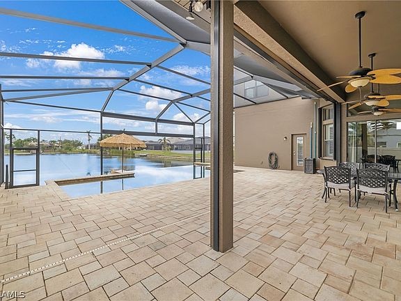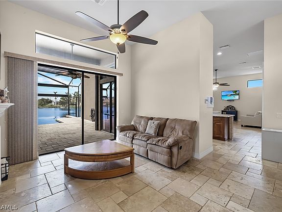BACK ON MARKET! Buyers were not serious! Feel the Grandeur when you enter this home from the openness of 12ft ceilings. Your eyes will be drawn to the infinity edge pool overlooking Lake Jolie through the large picture window screening. With western rear exposure the sunset views are PRICELESS! The saltwater pool has a tanning ledge and swim up bar to enjoy beverages poolside, complete with a tiki style umbrella for shade. With nearly 3,100 sf of living area and 5,400 sf total, this home has all the space you need. 4 bedrooms + den, 3 bathrooms and 3 car garage. Beautiful travertine tile flooring, double-sided wood burning fireplace, granite counter tops, automatic roll down storm screens along entry / lanai, vinyl privacy fence, new roof 2022 (prior to Ian), manablock plumbing, central vacuum system, whole house intercom and security cameras. All interior walls are insulated for sound dampening. Assessments Paid. Too many features to list, this home is truly a Must See! If viewing property on non-MLS formats, the correct address is 1310 SW 11th PL.