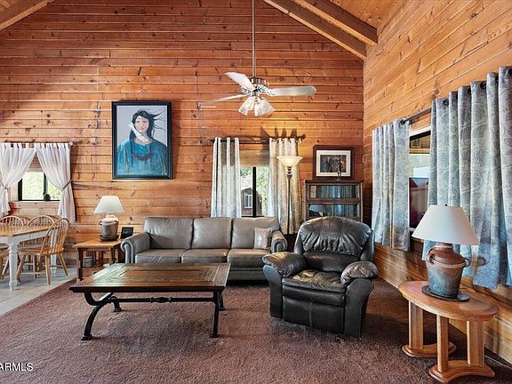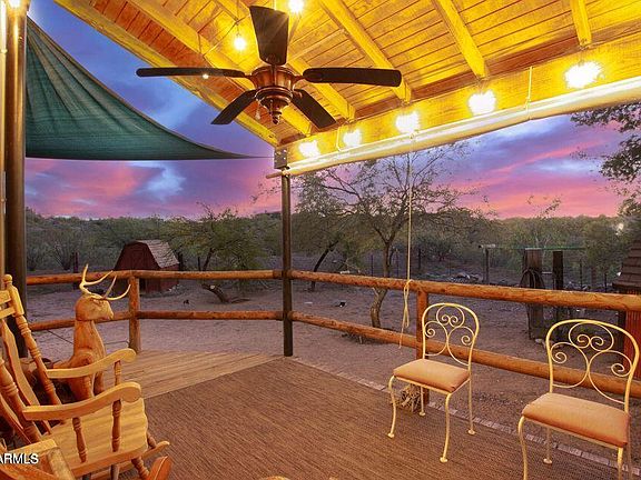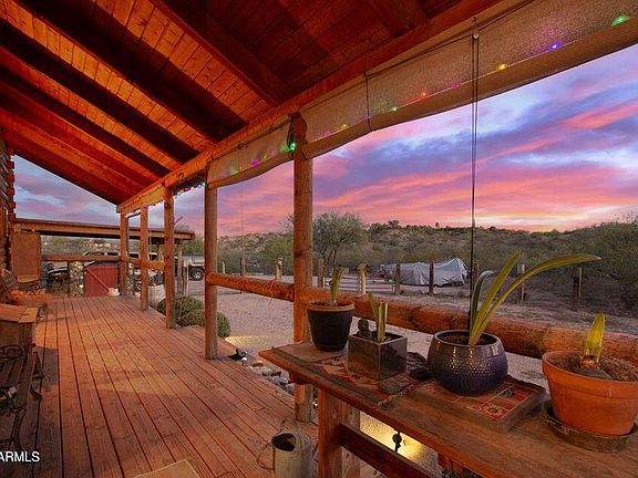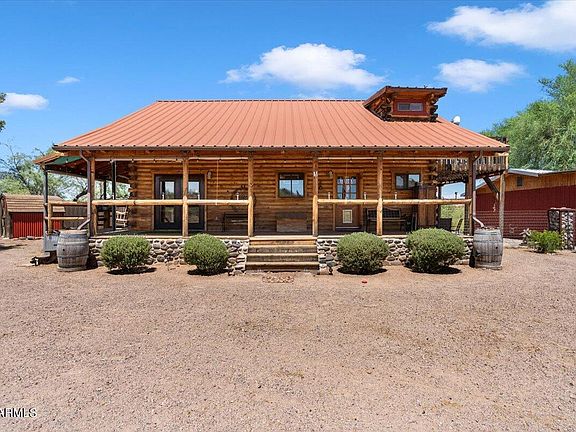 Welcome to your peaceful retreat in Wickenburg! This beautifully-crafted log home offers 3 bedrooms & 2 baths across 1,490 square feet of comfortable living space, nestled on 12.75 acres of endless possibilities. Enjoy complete privacy while being conveniently close to historic Wickenburg, just 4 miles from the Wickenburg Ranch Golf & Social Club, and near all the local restaurants & shopping spots. Step inside to a warm & inviting interior, where exposed beams on the vaulted ceilings add character, and soft carpet ensures coziness in all the right places. Enjoy the bright & airy living room, perfect for entertaining, and flows seamlessly into the dining area and the fully-equipped kitchen; A cook's delight with ample cabinet & counter space, a peninsula with breakfast...CONTINUE READING. ...breakfast bar seating. Unwind in the Arizona room, ideal for relaxation at any time of day. The romantic main suite features a cozy sitting area, balcony access, a private bathroom & a walk-in closet. The other two bedrooms are perfect for guests, sharing a full bathroom that's just right for their needs. Outside, the views are simply breathtaking, with stunning sunsets behind the mountains, all enjoyed from the comfort of your covered patio. The expansive, fenced backyard offers room for all your outdoor passions, from storing your toys in the storage shed, working in the detached 2-car garage with a carport & workshop, to caring for horses in the arena, corrals & vast roaming space. This property is more than just a home; it's a lifestyle waiting for you to make it your own. Come explore all the potential this exceptional property has to offer!