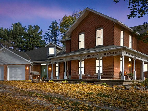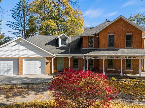 Welcome to The Emrich Homestead built in 1897. See for yourself this beautifully restored classic Victorian-American farmhouse with all the amenities for modern living while preserving all the original character you're looking for. This 4 bed, 3 FULL bath all-brick home is nestled on a sprawling 3.64-acre property and close to pufferbelly trails, bicentennial woods, and 10 minutes from Dupont Rd. From the moment you arrive, you'll be captivated by the charm and character of this home. You're invited in by the beautiful wrap-around porch, offering the perfect spot to enjoy morning coffee & evening sunsets. Inside you'll be greeted by a spacious entry and updated open concept kitchen that's both functional and beautiful with new SS appliances, leathered granite countertops, an industrial SS farmhouse sink and 4 person breakfast bar seating. The Dining area has space to seat up 10 people making it perfect for entertaining and hosting family gatherings. Kitchen is open to the large sunlit family room. Around the corner you'll find a bonus space perfect for crafts, hobbies, or a home office with separate entry and nearby full bath featuring vintage tilework. Separate Den with pocket doors and built in barnwood desk and closet can also serve as a main level bedroom. Laundry room is also conveniently located on the main with built-in pantry cabinets and utility sink. Head upstairs to find the owner's suite with gorgeous views, a walk-in closet and full bath featuring a double vanity, quartz counters, tiled floor + Walk-in shower wired for Bluetooth. Upstairs, you'll also find a bonus room with access to the walk-in attic, 2 more bedrooms and another updated full bath with soaker tub and walk-in tiled shower. Below the home, sits a clean cellar for your canning and storage needs. The 3-car attached garage provides convenience and ample storage space along with the pole barn, ideal for storing large equipment, large parties or can be rented out for extra income potential. Outside, you'll enjoy the natural privacy with mature fruit trees including pears and apples, and an abundance of sugar maple trees creating a picturesque landscape. A full 30x30 garden awaits your green thumb to cultivate fresh produce in-season. This historic farmhouse is more than just a home, it's a journey through time with all the modern amenities you desire. Don't miss this opportunity to make the slice of history your own.