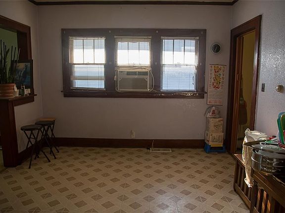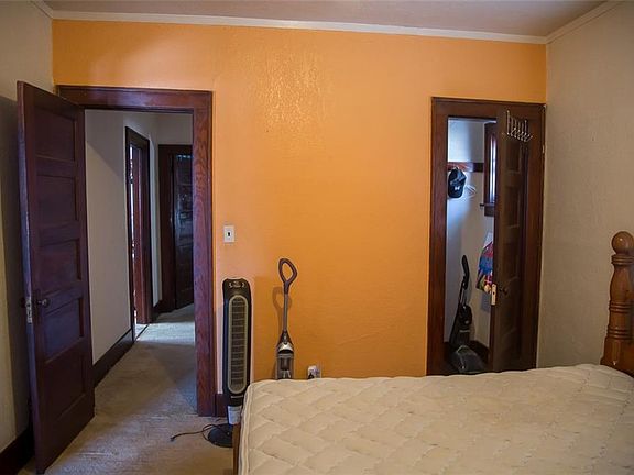 This one could be really cute with just a little bit of updating. Beautiful hardwood floors have been protected under carpets for generations. Dark wood trim would really be offset by a fresh coat of paint. Two beds and a bathroom off the larger living area, which is divided between the living room and dining room the way they did in 1915. Both a front porch AND a back porch!