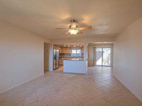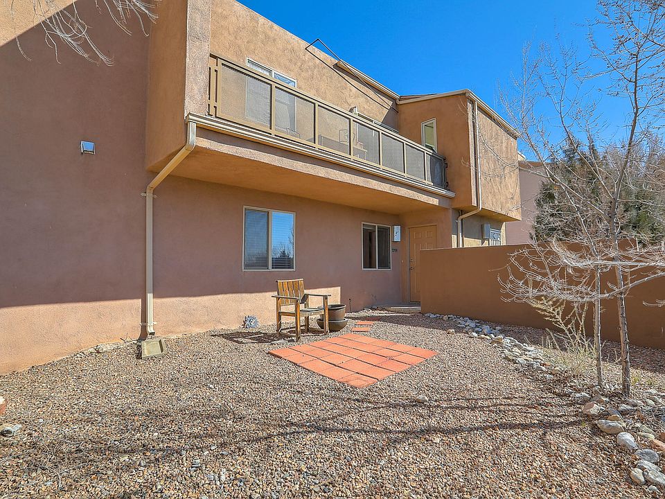 Charming, clean two bed/two bath home near the foothills of the Sandia Mountains. The living room, dining room and kitchen are all open to each other creating an inviting space. The updated kitchen has a window over the sink lots of cabinets and counter spaceand a stainless steel refrigerator, range and microwave.The primary suite includes a walk-in closet and 3/4 bath. East facing and west facing outdoor spaces. Close to walking/hiking trails