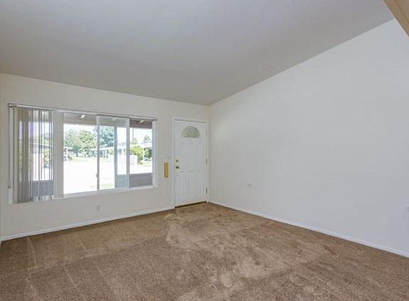 Mutual 9. This charming home is northeast facing partially expanded, has drive up parking and double pane. The patio has ceramic tile flooring and a large opening skylight. The living room has wall to wall carpet, smooth ceiling and a heat pump (air condition). The kitchen has an upgraded oven, microwave, large opening skylight, wood style laminate flooring and a mirror over the sink. The bathroom has linoleum flooring, an easy access shower, Coran counter top and a large opening skylight. The bedroom has been fully expanded and has a large walk in closet, wood style laminate flooring, ceiling fan, smooth ceiling, wall heater and a sliding glass door to the patio. The carport is located in 108, space 9
