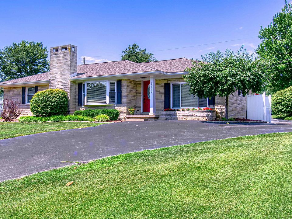 Situated on a 1.29+/- acre lot with a stocked shared lake this immaculate 4 bedroom 2 bath ranch home with finished lower level and detached 3 car garage with workshop offers many updates throughout. This open floor plan offers spacious great room features a stone fireplace with wall mount TV and a large window overlooking the lake. The great room with dining area opens to the updated kitchen with an abundance of custom cabinetry, pantry, newer appliances and breakfast bar. Off the kitchen there is a sunroom which is the perfect place to relax and has access to the beautiful stone patio and an abundance of yard space. The main level owner’s bedroom offers access to an updated bath with walk-in shower, jetted tub, and double sink vanity. This split bedroom design offers two additional spacious main level bedrooms with access to the second updated full bath. The lower level offers an open rec room perfect for media and games, a fourth bedroom, laundry, and an abundance of storage. The 30x57 detached building offers three car garage plus a 21 x 30 workshop that is perfect for hobbies and more! This great home offers many recent updates including updated kitchen & baths, engineered hardwood flooring, newer roof & HVAC, and much more! This home is located with convenient access to shopping, dining, great schools, and major employers.