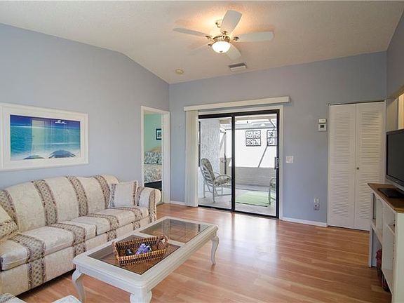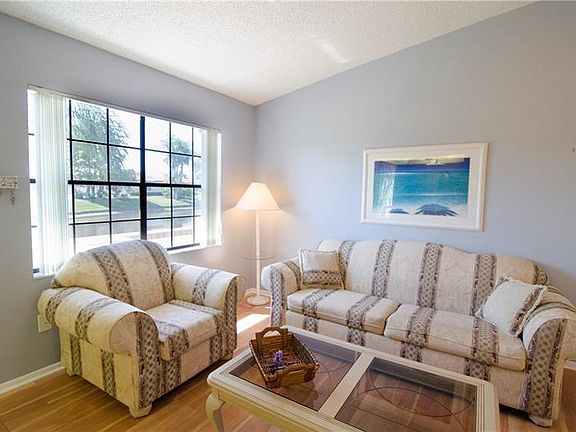 You can't help but smile while living in this light and bright floor plan. What a great layout in this 2 bedroom, 2 bath villa with a relaxing view of the pond and beautifully kept grounds. This unit is situated to offer privacy on both sides with the entry patio facing the pond and a separate screened lanai in the courtyard. This unit is nicely updated with fresh paint, laminate and tile flooring, new wood cabinets with soft close drawers and Solid Surface counter tops. Enjoy the convenience of this maintenance free community, just minutes from shopping, dining, boating and several beaches on the Gulf of Mexico! There are a dozen golf courses within as many miles! Bring your swim suit, golf clubs and flip flops! The furniture is available for purchase under a separate agreement.