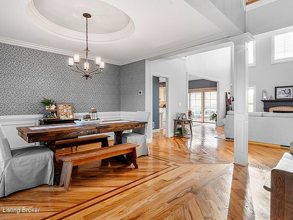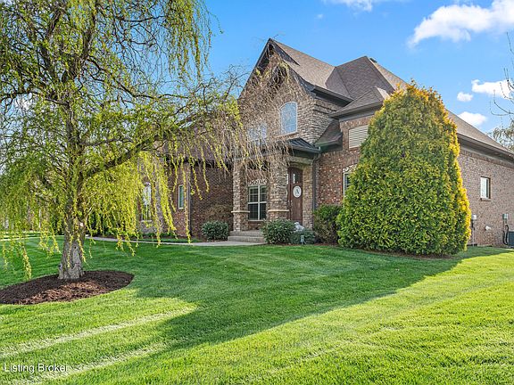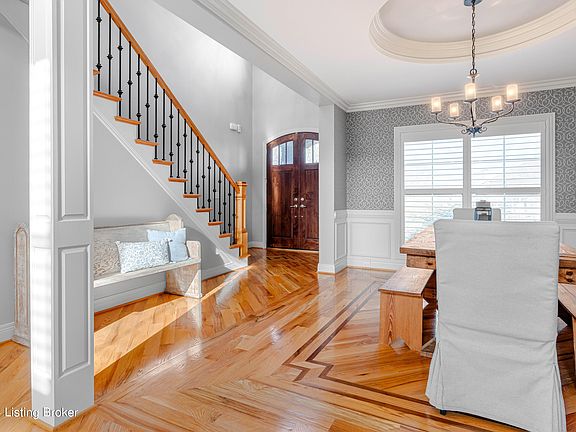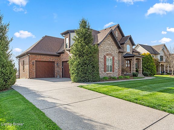 Experience an extraordinary gem when you tour this home on a picturesque lot in the desirable Longwood Subdivision, conveniently close to Harmony Elementary and North Oldham Middle & High Schools. This elegant and lovingly maintained property has 4 bedrooms, 2 full bathrooms, and 2 half bathrooms, as well as a finished basement and attached double-car garage and a separate third garage that is accessible through the laundry room. Through grand double doors, you will be captivated by the exquisite décor that adorns every corner, beginning with the intricate details embellishing the hardwood flooring. The ambience is open and inviting with calming hues, soaring ceilings, and natural light pouring in through a multitude of windows with Plantation Shutters. A formal, columned dining room is expertly designed with exquisite wall covering, wainscotting, and remarkable trim work within the flooring. Above, a unique circular tray ceiling accentuates the timeless charm of the dining area and will create a perfect setting for your dinner guests. The open layout of the home transitions seamlessly into the great room where you are beguiled by a soaring ceiling elevated with rustic wooden beams. Creating an inviting space for both gatherings and relaxation, you have a cozy fireplace and a view into the eat-in, gourmet kitchen. The heart of the home, your kitchen is complete with custom cabinetry, granite countertops, stainless appliances, and a butcher block island with ample storage. Enhancing the functionality of the room, additional features include a large pantry, a coffee bar nook, and a built-in desk space. The entertainment space extends from here onto a screened-in back porch, ideal for cookouts and watching games outdoors. Completing the main living area is a mudroom with built-in storage, a first-floor laundry room with utility sink, and access to both garages for added convenience and organization. The first floor primary bedroom exudes comfort and style with a custom painted tray ceiling, luxuriously soft carpeting with premier padding, and an ensuite bath with jetted tub, a spacious glass shower, and a well-appointed walk-in closet. Upstairs, a catwalk offers views of the main level, as well as three generously-sized bedrooms, and a shared full bath with two separate vanities. One of the bedrooms has a charming play area with delightful sconces that add a touch of whimsy, built-in cubbies, a cozy window seat, and a huge closet. Moving to the lower level, your custom-designed finished basement showcases attention to detail with brick walls, handcrafted wood panels, a concealed nook under the staircase, and barn doors. An additional separate room provides a versatile space as an office, craft room, or guest bedroom. Additional features include cork flooring and carpeting, 8.5 foot ceilings, painted in a sleek black hue with recessed lighting, and a convenient half bath. Two unfinished storage areas offer endless possibilities for home organization. From top to bottom, inside and out, this gem is stunning and ready for you to come home. The quiet and peaceful community provides an abundance of amenities, including a pool, clubhouse, and tennis and pickleball courts. Schedule a private tour today!