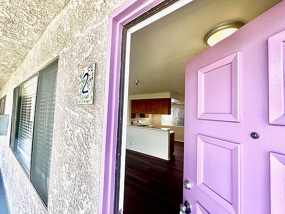 This adorable apartment is located on the second floor/first level, stairs only -no elevators. A peaceful, purple door beckons you to walk inside. With an open concept living room and kitchen, this pad makes you and your guests feel right at home. The kitchen includes a NEW gas stove, NEW dishwasher, plus a breakfast bar. Through the hallway you'll notice plenty of closet/cabinet space, two sunny bedrooms with fantastic closet space and a full bathroom in between. New vinyl hardwood flooring throughout, water and trash are included, coin-operated laundry on-site, one car covered parking space with storage unit, a small pet will be considered with an additional security deposit. Second parking space available for $50/month.