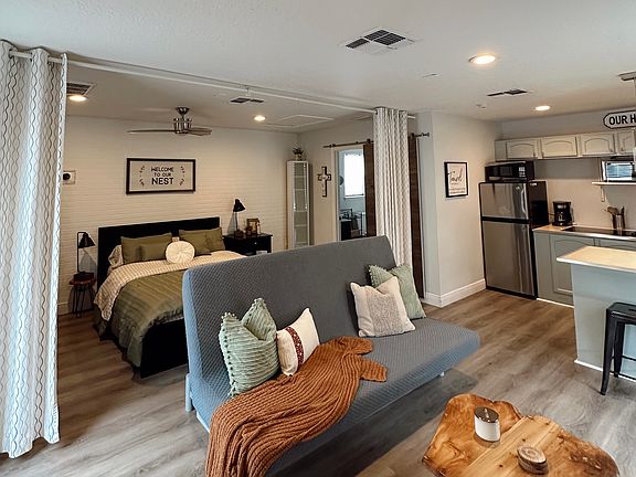 This fully furnished studio features a cozy living space with beautiful sunsets visible right out of the window.
