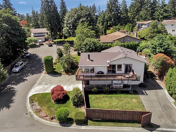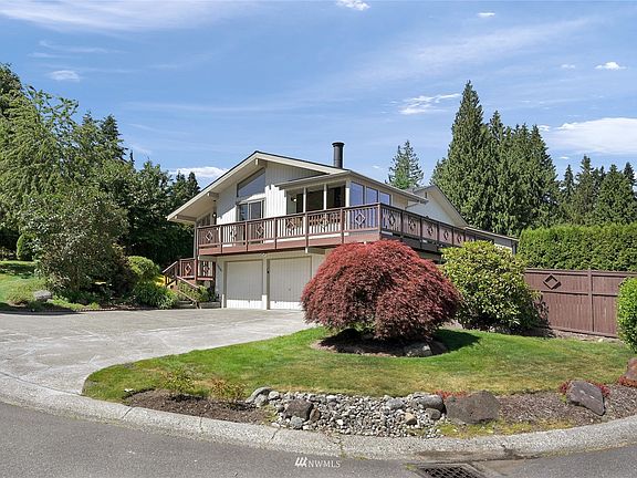 VIEW RIDGE EAST! Stunning mid-century modern home on a private corner lot.This well maintained 4 bedroom home features a circular fireplace w/ seating area, vaulted ceilings, wrap around deck, and Mountain views. An abundance of wood wrapped floor to ceiling windows flood the home w/ natural light.Large primary suite w/ door leading out to deck, updated bath w/ heated floors.2 more large bedrooms up & 1 on the lower level.Office & family room w/ gas fireplace, laundry room w/ laundry chute.Hot tub, cherry & apple trees!Raspberry & blueberry bushes.NEW FURNACE! w/ filtration system.Extra deep 2 car garage, 2 Elec panels w/space for additional circuits.Drive into fenced back yard.RV & additional parking.Conveniently located.Minutes to hwys.