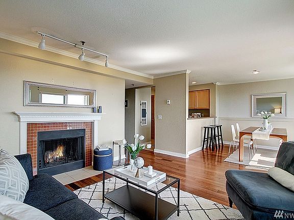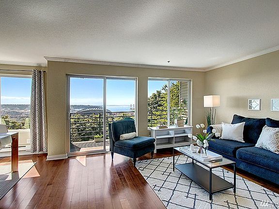 Enjoy breathtaking views of downtown Seattle & Safeco Field from this beautifully maintained 2 bedroom condo. Spacious kitchen, dining and living room open up to a private deck with unobstructable views of the city. Crown molding throughout, hardwood floors, new carpet, fireplace, and granite counters. Walk-in master closet & laundry/pantry for ample storage. Minutes from downtown, I5, I90-perfect for commuting! Secure entrance. Outdoor pool/hot tub, rec room, pet friendly, and no rent cap!