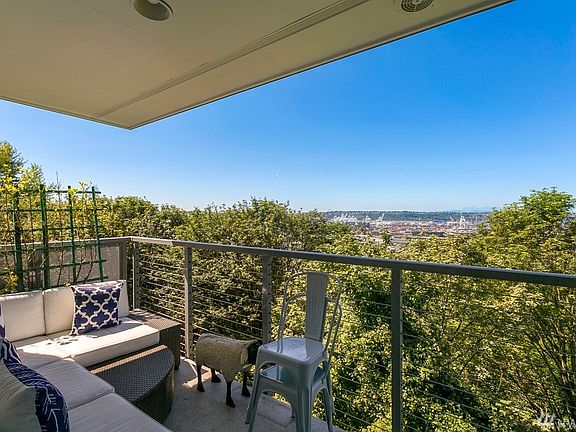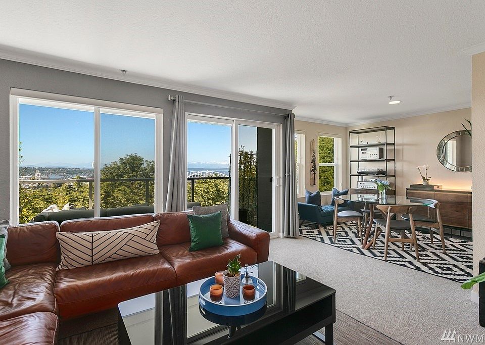 Beautifully updated 2 bed/1.25 bath end-unit condo features amazing views, slab granite counter tops, SS appliances, wood-burning fireplace, in-unit full size W/D, 2 underground secure parking spaces, pool, hot tub, clubhouse, fully gated community and sits only minutes away from downtown Seattle. Even includes a pet relief area! The neighborhood offers easy access to public transport, parks, shopping, restaurants and stadiums. No rental cap!