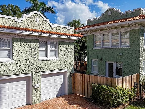 Known locally as The Cake House, this timeless Mediterranean masterpiece is one of Old Northeast’s iconic historic residences, a century-old architectural gem originally designed by the same architect behind Dunedin’s famed Fenway Hotel. On a prized corner lot along picturesque Beach Drive, the home blends Havana-inspired design and 1920s craftsmanship with thoughtful modern luxury updates throughout. Showcasing original interior and exterior brick, refinished hardwood floors, detailed millwork and a distinctive pagoda-style roofline, the property radiates warmth, history and sophistication. Inside, a light-filled tranquil sunroom opens to flexible dining and living areas pre-wired for audio/visual, ideal for entertaining. The main level includes a formal dining room, and a full butler’s pantry with bar functionality off the chef’s updated kitchen, featuring a movable island and period details that honor the home’s heritage. The enclosed laundry room includes a washer and dryer, with an adjacent mudroom and indoor tankless water heater. The luxurious primary suite is a sanctuary of elegance, complete with crown molding, a California closet system, dual vanities, and an oversized walk-in shower clad in Calacatta marble with opulent fixtures and abundant natural light. Guest accommodations are equally inviting, with spacious bedrooms, dual closets, and beautifully updated baths that harmonize with the home’s character. Outdoor living is elevated with a private Mediterranean-style courtyard featuring a custom wood-fired kitchen, gazebo dining pavilion and restored original deck pillars surrounded by lush new landscaping. Every detail invites relaxation and connection. Additional highlights include updated electrical and copper plumbing, new under-home ductwork (2024), a newly installed CPVC water main to the street and ongoing air conditioner maintenance for peace of mind. The detached two-car garage accompanies a fully equipped one-bedroom, one-bath ADU with kitchen, washer/dryer, and private entry, ideal for guests, extended family or income opportunity. Set on a 7,920-square-foot lot in one of St. Petersburg’s celebrated neighborhoods, 1311 Beach Drive NE is a rare blend of architectural authenticity and modern livability. Every improvement has been permitted, curated and meticulously maintained, offering a once-in-a-generation opportunity to own one of Old Northeast’s beloved landmarks.