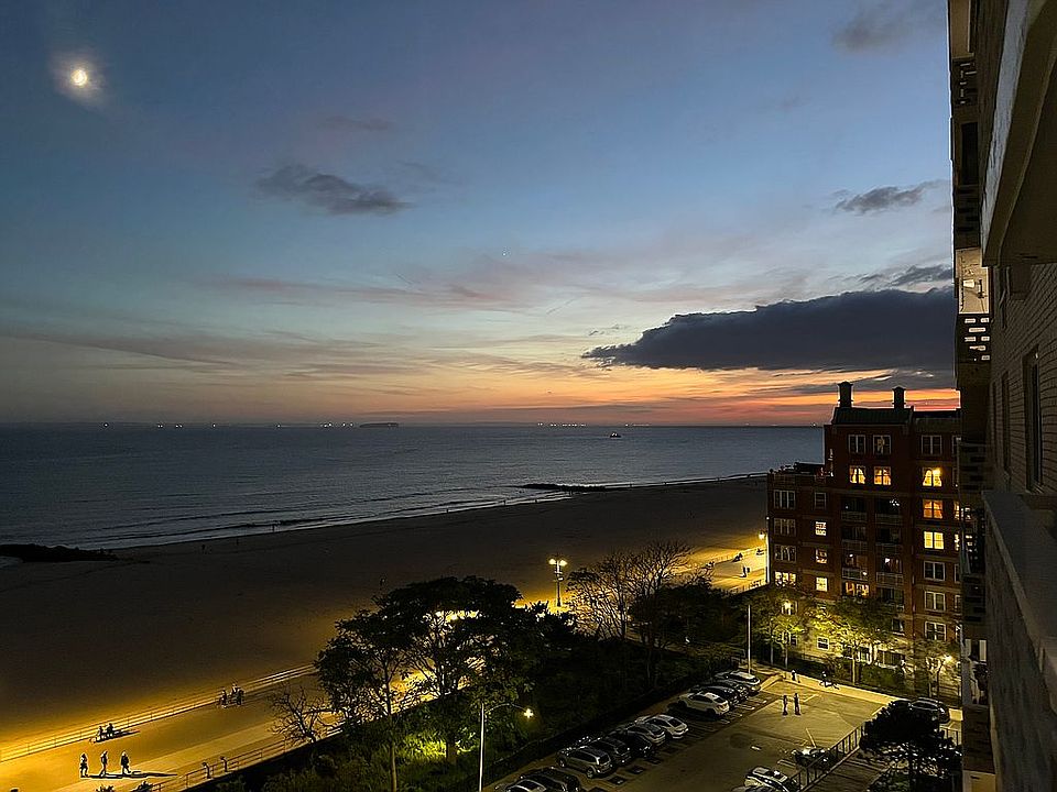 LUXURY OCEANFRONT junior-4 apartment on the 10-th floor with views of the Atlantic Ocean and best beaches in NYC. Open any of the 5 direct oceanfront windows for that fresh ocean breeze. Escape from the noisy city in your beachfront oasis, yet only 20 minutes away from Manhattan by train. Experience views of sail boats, Cruise Ships, and beautiful sunrises/sunsets. Conveniently just a few minutes walk to B/Q trains, food markets, schools, restaurants, boardwalk and beach. Large Master Bedroom, Lots of light, Lots of closet space, Large Oceanfront balcony with glass door, panoramic oceanfront views from dinning room. Amenities include a 24 hr doorman, gym with steamroom, bicycle room, storage, even Kayak storage, and multiple parking options on property. Literally step out to the beach and boardwalk.