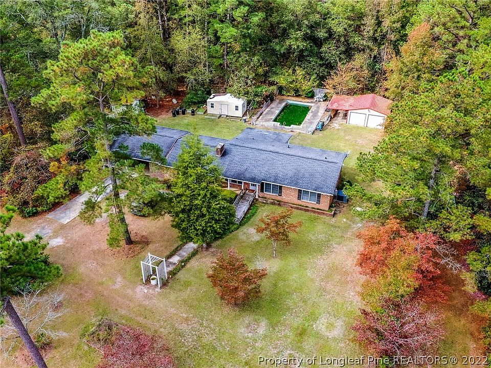 Brick ranch situated on over 13 acres! Conveniently located near Hope Mills and Fayetteville, this residence has so much to offer! The kitchen features generous cabinet/counter top space and eat in breakfast bar. The dining area opens to a double door sunroom access overlooking the back yard. A formal front living room with fireplace and separate oversized den provide the extra space everyone desires. Hardwood floors under some carpets. The back yard is equipped with a large 20X20 detached garage/shelter and in-ground pool. Pool needs TLC but has great potential. New Heating/AC unit in 2020. Make this your next home today!