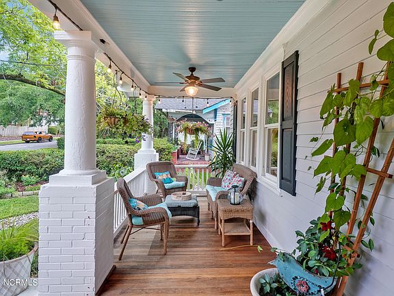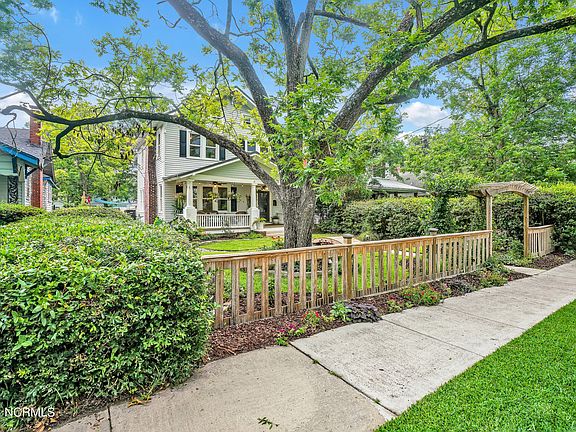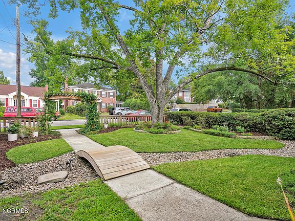 This gorgeous property is a storybook ready to be written. Enter the jasmine-covered arbor to the landscaped front yard with towering pecan trees, a winding river rock bed + wooden bridge. Sit a while on the mahogany front porch then enter this treasure with the perfect mix of historic features & modern conveniences. Just two years ago, the home was taken to the studs & remodeled including a metal roof, HVAC (zoned), & windows replaced. The modern kitchen has updated cabinets, SS appliances, tile backsplash, farmhouse sink, & granite countertops + breakfast bar. Historical features saved including original hardwood floors, fireplace (converted to gas logs), built-in glass front cabinets in the living room, solid 5-panel doors with crystal door knobs, plus tongue & groove accents. Upstairs is the primary bedroom with hardwood floors + updated en suite bath & walk-in closet, plus 2 additional bedrooms with updated guest bath off the hallway. Pull-down stairs lead to a floored attic for storage plus a secret bonus room (not incl. in sq. ft.) with A/C to use as you choose. Endless hot water with the natural gas tankless water heater. Recent additions: Reverse osmosis faucet, ring doorbell & cameras, irrigation system, 12 x 12 screened porch overlooking the fire pit, swimming pool with NEW pump & wooden stairs, planters & privacy screen + cabana/shed for outdoor entertaining with a bar & workshop/storage. Fully fenced private yard with a designated dog run & doggie door for Fido's personal convenience. Off-street parking and convenient alley access in the back. All appliances + washer/dryer included, many furniture pieces are negotiable. Downtown Wilmington boasts sidewalks on the lovely tree-lined streets where you can explore nearby parks, landmarks, & all that downtown has to offer. Only 4 blocks to Soda Pop District with Hi-Wire Brewery & the new Bowstring Brewyard. Minutes to the Cape Fear Riverwalk, shopping, dining, golf, & Wrightsville Beach!