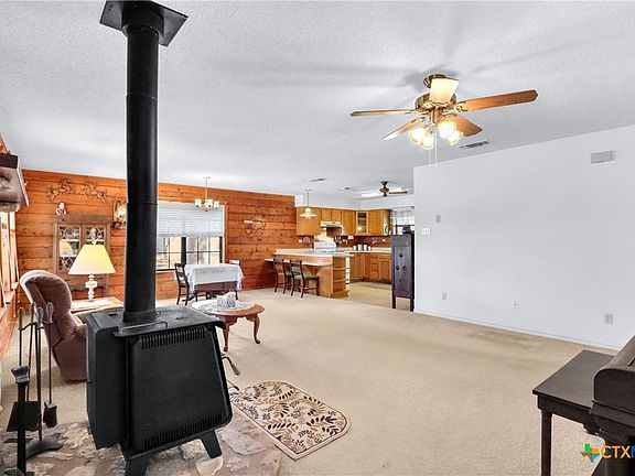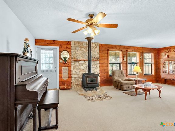 Charming 2 bedroom Log Country Home on acres! Property fenced and cross fenced with barns for your animal needs. Home features custom wood cabinets, large bedrooms, wood burning stove, walk in closets and embraced with 2 large covered porches. Property is covered with mature trees, water well, barns, storage/workshop and an oversized garage. This home is east of Seguin within 10 minutes from town, shopping or medical needs.