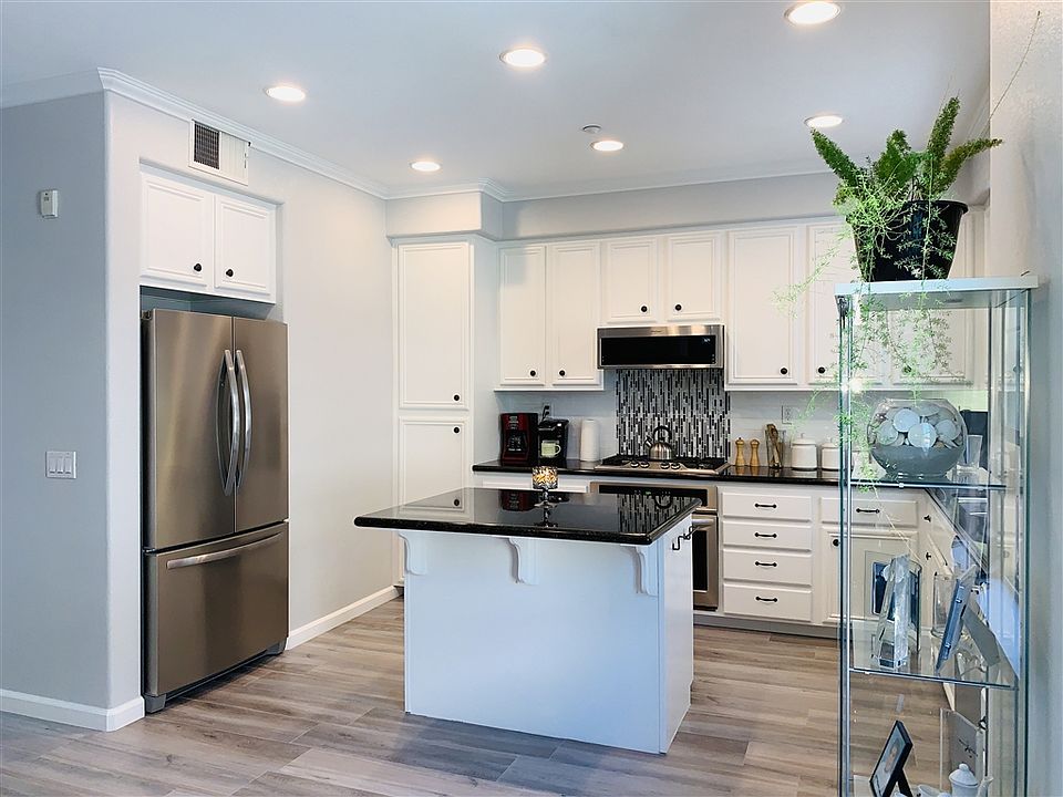 - Built-Ins, Ceiling Fan, Granite Counters, Shower, Storage Space, Bathtub, Remodeled Kitchen, Shower in Tub, Recessed Lighting, Crown Moldings, Kitchen Island