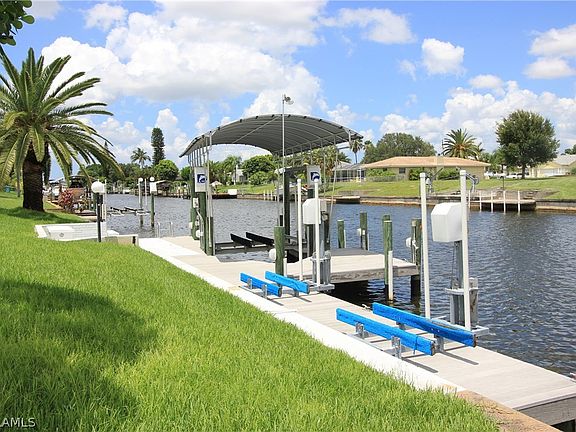 Gulf-access single family home minutes to the River. NOT IN A FLOOD ZONE. NO HOA fees. All assessments PAID. 3/2/2 pool home offers generous room sizes, ample storage and large closets. Great room concept with vaulted ceilings and all rooms have paddle fans with remotes. Master bath newly renovated. Eat-in kitchen features new refrigerator and dishwasher plus a pantry. Brand new AC in 2015. Easy to care for floors are wood laminate and tile. Immaculate inside and out with a lush lawn leading past the sparking pool to a boater’s dream dock & lift setup. Canopy, composite decking, Captain's walk dock complete with water, electric and lighting. Boat lift has added security using patented Swing Stoppers. Two wave runner lifts to boot! Open floor plan is perfect for entertaining and living the Florida lifestyle. Pocketing triple set of sliders are typical of resort-style living and secured by electric hurricane shutters. Best value in the Cape!!! This clean…this view… this location… this price… this one won’t last long.