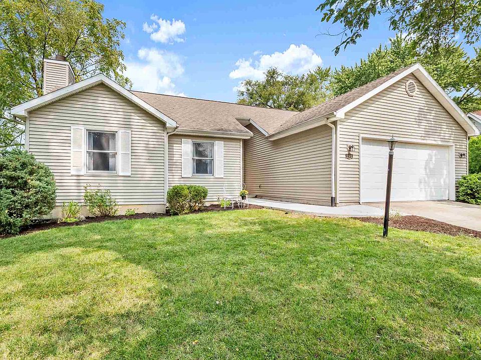 Remarkable 3 bedroom 2.5 bathroom ranch home on full finished basement with many recent updates! Near downtown amenities and the YMCA, this spacious home features an open concept with cathedral ceilings in the main level great room, large bedrooms, and a main level master suite with jetted tub. The newly-renovated kitchen offers new counter tops, a breakfast bar, and updated cabinets and hardware. An open staircase leads to the finished basement where you will find an expansive rec room with fireplace, additional living space for dining and entertaining, and a large laundry room with included utility sink. Newer vinyl plank flooring and newer carpet throughout main level and basement. Property sits on a double lot with privacy fence, mature trees, and an open deck, perfect for entertaining. Large attached two-car garage. All appliances stay!