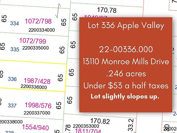 - Additional parcels included: Nice lot across the street from beautiful farmland. In AVL but has a country feel. Great lot for a new home or a lot to hang onto as an investment and then enjoy theamenities of Apple Valley Lake. 511 acre swimming, boating and fishing lake, 2 pools, 3 beaches, clubhouses, parks and more! Buyer to pay the POA transfer fee.