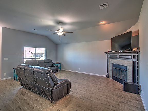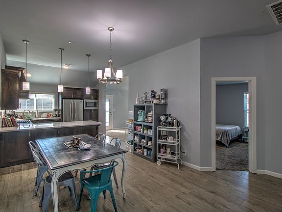Welcome home to soring ceilings, a LARGE living, dining and kitchen, all floored with plank tile - EXCELLENT for allergy suffers and easy cleaning. The rich cabinetry found throughout is complimented by crisp white countertops, a spacious eating bar allows for 4 stools and notice the size dining table it accommodates?! The second living off the kitchen is Fabulous space and can be used for whatever your family is needing. Primary suite allows for king size furniture & 2 walk in closets are a huge plus!