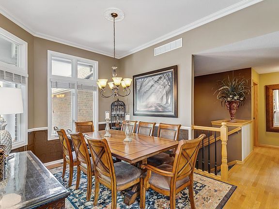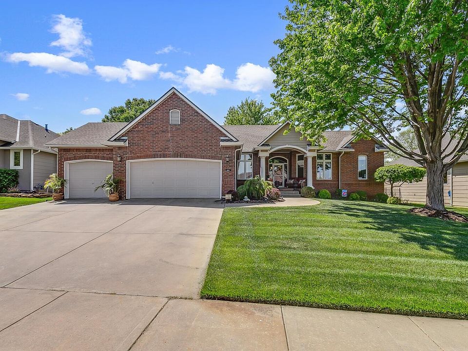 The pineapple is a symbol of hospitality, and it is entirely appropriate that lighted pineapples welcome you to 13115 E Tallowood! This 5 bedroom, 3 bath brick ranch is FULL of upgrades and extras, making it the perfect place for daily life, entertaining, and celebrations! The foyer opens into the formal living room and formal dining room, both with hardwood floors and oversized windows. Down the hall you'll find the heart of the home, the open concept kitchen, hearth room, and informal dining. The granite counters, roll-out cabinets, and stainless appliances will please any chef! The built in desk is a perfect drop zone, organizer, or with a little modification it could be a fabulous coffee bar! The informal dining area is well lit with natural light from big windows and a glass slider door, leading to the serene and private backyard. The hearth room features a gas fireplace and custom built-in cabinets for plenty of additional storage. A split bedroom plan, 2 bedrooms and a full bath round out the east side of the main floor. Over on the west side you will find a primary ensuite that will knock your socks off! The private retreat includes the bedroom with coved ceiling featuring faux leather finish, a private office (or nursery? private lounge?), and fabulous bathroom with double granite vanity, separate water closet, TV over the jacuzzi tub, separate shower, and enormous walk-in closet. Downstairs you'll love the entertaining space with the granite walk behind bar that includes a full-sized sink, mini fridge, and a dishwasher! Smart tile placement behind the bar and in front of the slider protect the floor from wet hot tub feet and bar spills. Another fireplace with more custom cabinetry as well as an area for table games makes this a cozy spot to spend the day! Two more bedrooms, a full bath, and a gym with full sized mirrors complete this awesome lower level. Out back you will love the covered deck with lighted steps, covered patio below with tile floor, and stamped patio for plenty of outdoor entertaining options. The gorgeous palm sculpture by Andover artist Wendell Turner with Designer Palms gives vacation vibes. The mature trees and lush landscaping provides plenty of privacy. The drip and sprinkler system will keep the lawn and landscaping happy all summer. The hot tub will keep YOU happy! The impact resistant 50-year roof will keep your insurance friend happy! The oversized 3 car garage has plenty of space for your tools, toys, and cars. It'll stay organized with the built-in storage and workbench! Pull down and head up the attic stairs and you'll find even MORE storage with an attic floor and lighting! This home is located in a very desirable neighborhood with gorgeous green space and ponds, a neighborhood playground, and a neighborhood pool. Close to the best schools, shopping, and entertainment, this house is a win-win-win!