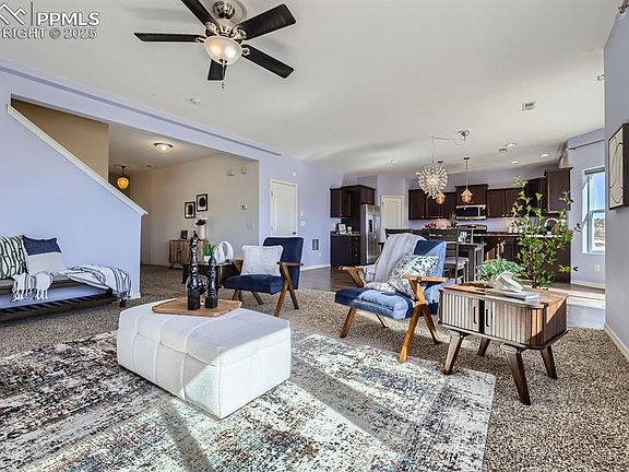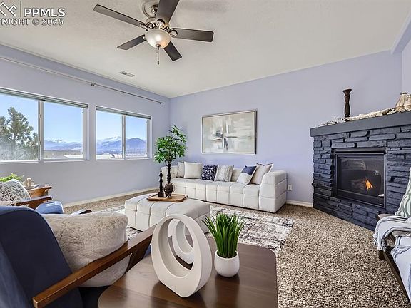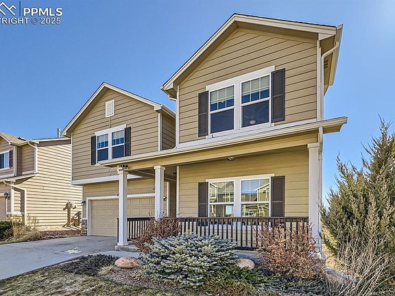 Meticulously cared-for home, showcasing breathtaking mountain views. Located in the highly sought-after Greyhawk neighborhood, this property combines comfort, convenience, and style. The open kitchen is a chef's dream, featuring a gas range, a spacious under-mount stainless steel sink, and a large pantry. Enjoy cooking while taking in the stunning sight of Pikes Peak. Adjacent to the kitchen, the bright and airy living space is perfect for entertaining or relaxing with loved ones. Upstairs, every bedroom is thoughtfully designed with large walk-in closets, offering ample storage for the whole family. The upper-level laundry room includes a built-in cabinet for added convenience, making household chores a breeze. Step outside to the low-maintenance backyard, complete with a beautiful patio area, ideal for outdoor dining, entertaining, or simply soaking in the fresh mountain air. Additional highlights include a high-end Navien tankless water heater, ensuring endless hot water and improved energy efficiency. This home is truly move-in ready and waiting for its new owners to enjoy. Located just minutes from the Air Force Academy, District 20 schools, and a variety of restaurants, this home offers an unbeatable combination of tranquility and accessibility. Don’t miss your chance at this incredible property!