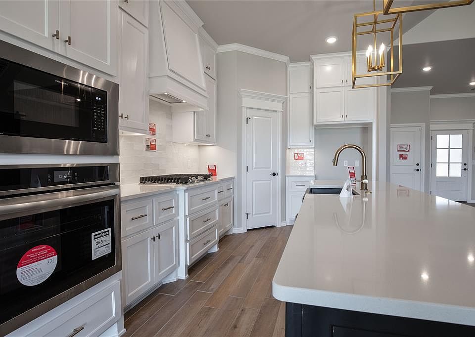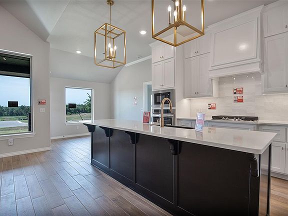 This Sage floor plan features 2,105 Sq Ft of total living space, which includes 1,850 Sq Ft of indoor living space & 255 Sq Ft of outdoor living space. This outstanding home offers 4 bedrooms, 2 full baths, 2 covered patios, a utility room, & a 3-car garage with a storm shelter installed. Because safety isn’t an option, Homes by Taber includes a roomy storm shelter in every home. The beautiful living room presents a beautiful cathedral ceiling, large windows, wood-look tile, a center stacked stone surround gas fireplace, a ceiling fan, Cat6 wiring, & a barndoor. The kitchen supports stainless steel appliances, 3 CM countertops, stunning pendant lighting, a corner pantry, custom-built cabinets to the ceiling, more wood-look tile, & a center island that holds a dishwasher and a granite composite sink. The primary suite welcomes a sloped ceiling detail, windows, a ceiling fan, & our cozy carpet finish. Prime bath has a dual sink vanity, a Jetta Whirlpool tub, a walk-in shower, a private toilet, & a HUGE walk-in closet. The secondary bedrooms and bathroom reside on the opposite wing of the house, offering privacy and solitude for all. The secondary bathroom features upgraded decorative tile as the main flooring. Outdoor living welcomes a wood-burning fireplace, a gas line, & a TV hookup for your flatscreen. Other amenities include our healthy home technology, a tankless water heater, a fresh air ventilation system, R-44 insulation, & so much more!