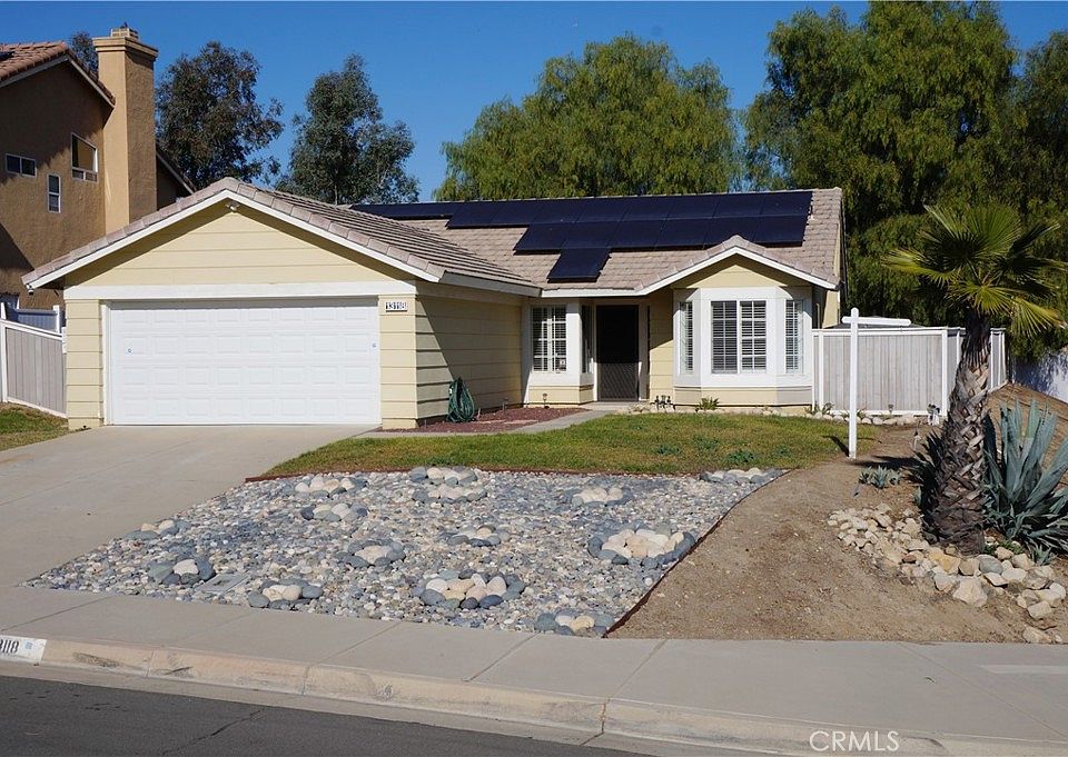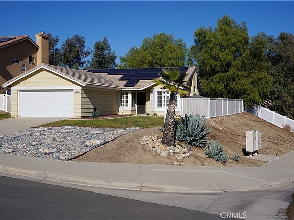 Beautiful Temescal Valley corner lot single-story 3- bedroom home in the desirable friendly community of Horsethief Canyon Ranch. 1281 sq. ft., 3 bedrooms, 2 full baths. 2 car garage and extra-long driveway. Super energy efficient home with solar, high efficiency Seer 17 Daikin HVAC system with Smart control, Tesla EV charging station in garage, new water-heater, and low water consumption landscape. SS appliances, granite counters, Aluma-Wood patio cover. New dishwasher and garbage disposal. Neighborhood is surrounded with views of the Cleveland National Forest. Close to shopping, restaurants and entertainment at nearby Shops at Sycamore Creek, Dos Lagos, Corona Crossings and Tom’s Farms. K-8th grade school is right in the neighborhood. The HOA features two swimming pools with spas, a clubhouse, parks, a complete workout gym, tennis courts, a dog park, events, plus much more. LOW, LOW TAX RATE and move-in ready!!!