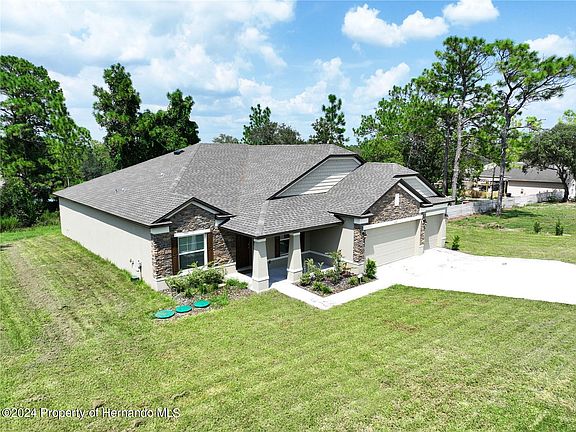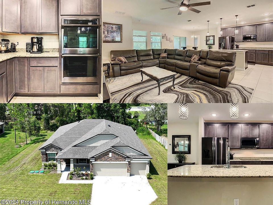 Welcome Home! This BRAND NEW SMART HOME, was just completed in March 2023 and is situated on .46 acres. This 4 bedroom, 3 bathroom, with a private office, is set up with an open floor plan and 3-way split bedrooms. The formal dining room and French Doors to the private office are located at the front of the house. The expansive Great Room offers more than enough space for entertaining as it is open to the eat-in kitchen, screened back patio, and formal dining room. This kitchen is truly a chef's dream, with a built-in sink in the island, stainless steel appliances, a glass cooktop, double wall ovens, granite countertops, a pantry, and lots of lighting. With a large owner's suite, you get to enjoy your privacy to the screened patio, his and her closets, and a full 5-piece en-suite. On the other side of the house, there are 2 generous-sized guest bedrooms and a guest bathroom. A second master suite is situated towards the front of the house, with a designated hallway, and a private en-suite with a walk-in shower. Coming in from the expansive 3-car garage is a mud room with a built-in desk and extra storage. Separate indoor laundry includes a brand-new stainless steel front load washer and dryer on pedestals. In this part of Royal Highlands, homeowners have quiet paved streets, large lots, and many new construction homes. Close to Weeki Wachee Springs and the famous Weeki Wachee Mermaids. Schedule your private showing to this newly built Maronda Home