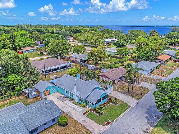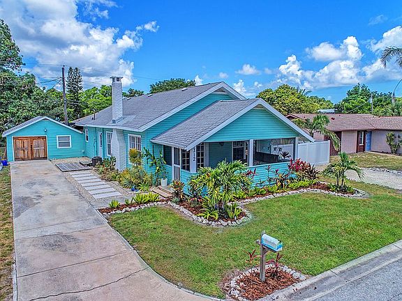 Adorable updated 1925 Old Florida beach bungalow in NW Bradenton! As you walk through the double front doors from the enclosed porch you enter a beach feel oasis! Living room floors are still in tact with original beautiful wood, shiplap walls finished throughout the entire living room, stylish finished wood burning fireplace and large windows with lots of natural light. Enjoy your oversized kitchen with butcher block countertops, breakfast bar and 2 sinks - kitchen overlooks another small living area with an additional fireplace. Well crafted bathroom with wainscoting finish, barn entry door, vanity sink and subway tile in shower. Crown molding throughout. Entertain family and friends in your fenced lush tropical backyard with covered patio deck that has plenty of room for games, grills, tv's and so much more! Located conveniently to Downtown Bradenton, boat ramps, Parks and Anna Maria Island! Comes complete with an attached workshop with bathroom. New Roof 2019!
