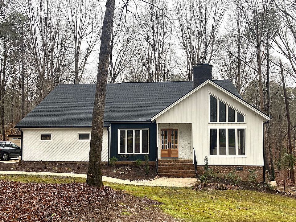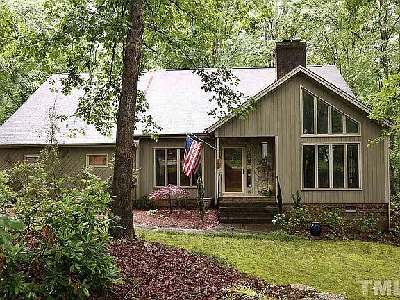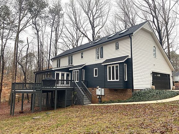 Beautiful fully updated contemporary home on 1.02 acre lot in desired N Raleigh location. 4 bedrooms, 3 baths with over 2800 sqft. Full bath & guest bedroom on first floor. LVP flooring throughout main floor and upstairs hallway. Quartz countertops w/ waterfall center island detail in kitchen, gas range, tile backsplash & wood range hood. Formal dining room w/ built in storage. Floor to ceiling wood burning fireplace in family and living rooms. Sunroom w/ expansive windows overlooking picturesque backyard.